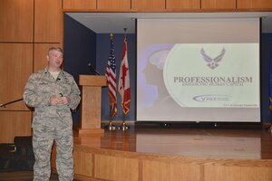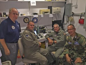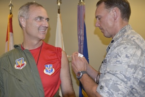 Lt. Gen. Scott Williams, Commander, 1st Air Force (Air Forces Northern) and Commander, Continental U.S. North American Aerospace Defense Command Region, asks Lt. Col. Greg Martin, 1st Air Force surgeon's office, "Did you already give me the shot?" after the painless flu shot. Williams was first in