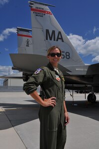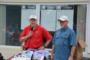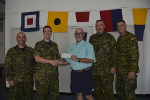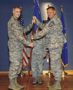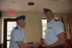 Royal Canadian Air Forces LCol Larry Weir, outgoing Canadian Detachment Commander, congratulates Royal Canadian Air Forces Maj David Kruger, Continental U.S. Aerospace Defense Region-1st Air Force (Air Forces Northern) Intelligence Directorate, after presenting him with the Canadian Forces’