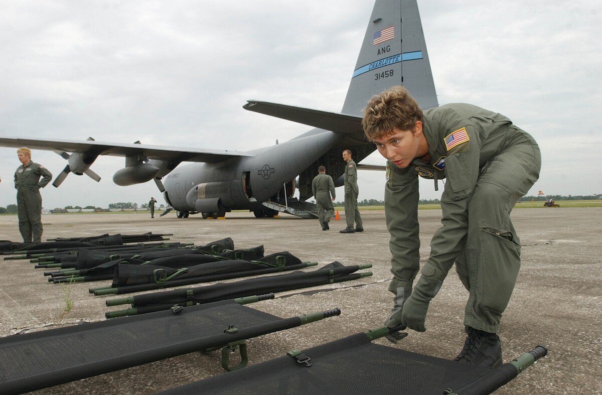 SEBRING AIRPORT, Fla. -- Senior Airman Amanda Sugg sets up cots here that were used in a C-130 to transport more than a dozen elderly Hurricane Rita evacuees back to Key West, Fla. Airman Sugg is an aeromedical technician attached to the North Carolina Air National Guard's 156th Aeromedical Squadron. (U.S. Air Force photo by Tech. Sgt. Brian E. Christiansen)